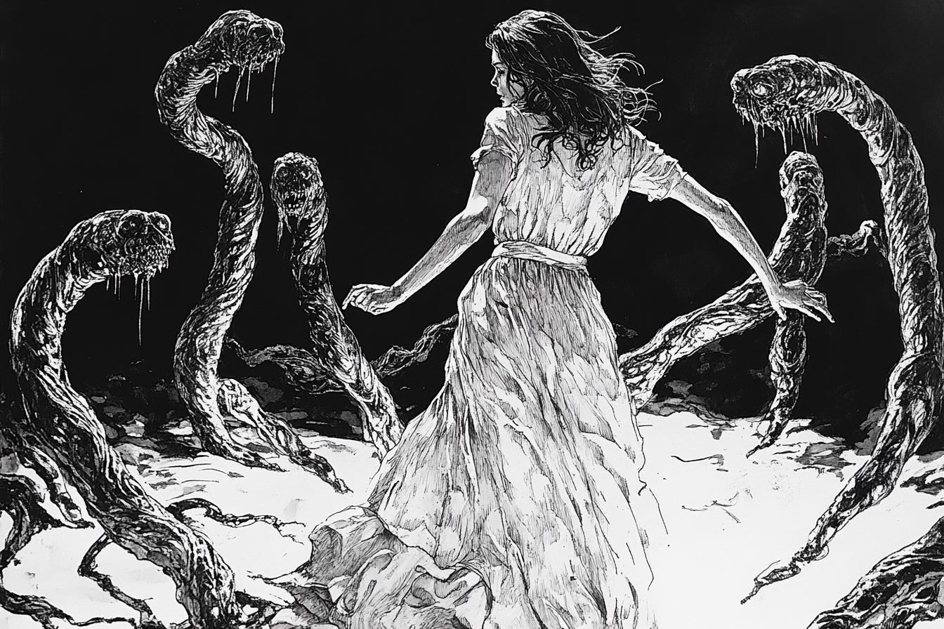 “I can’t describe how it happened, but all at once their foul talons had reached the girl; they were pawing her, were pulling at her hands, her arms, her body. She screamed—and I hope I’ll never hear another scream so full of black agony and soul-unhinging fright. Then I knew that she had yielded to them—either from choice, or from excess of terror—and knew that they were taking her away.