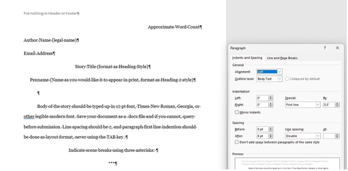5,000 to 8,000 words. Length should be close to the wordcount bracket! Genre is negotiable, as long as the story fits the concept and is entertaining. Any submission must be in Times New Roman (preferred, but you can use Georgia or other readable font), 12PT, double-spaced, with your name, title of the story, and your email in the document. Name the file as [STORYTITLE]-[YOURLASTNAME]—[ANTHOLOGYTITLE]. Send it in a .docx format as an attachment—no links. Refer to the submission guideline graphic below for how to format your story—It has all the information you need!